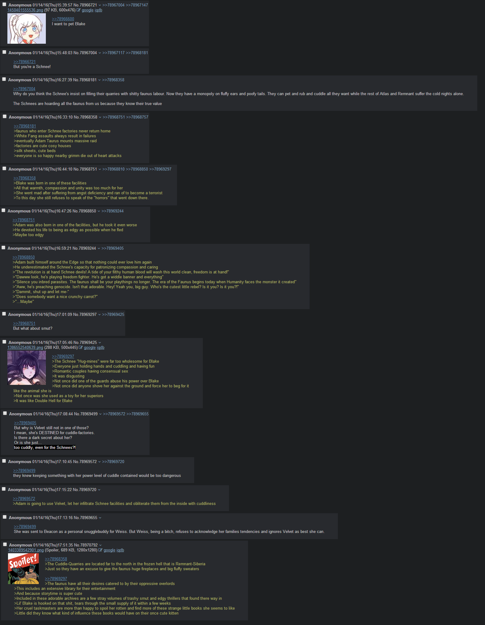Summary: A petty, self-obsessed kid who is suspiciously similar to Jaune Arc finds out that he is Jaune Arc. Armed only with having watched two seasons of RWBY, a history of substance abuse, and a pathological phobia of carbohydrates, he and team B.A.S.S. (Blake, Arc, Schnee, & Shadow Person) must survive as the world’s least competent B-team. But don’t worry, he’s done this once before, and it’s only ended in tragedy once!